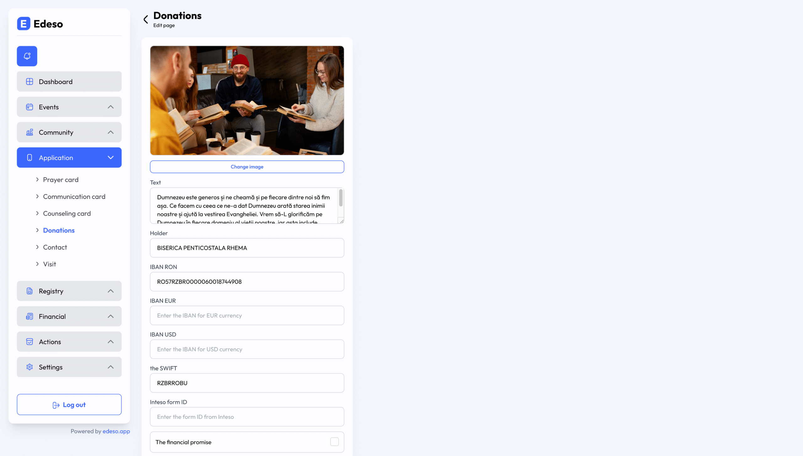 Da. Liderii pot edita textul paginii de donații, pot adăuga elemente vizuale și pot configura detaliile IBAN și SWIFT în setări.