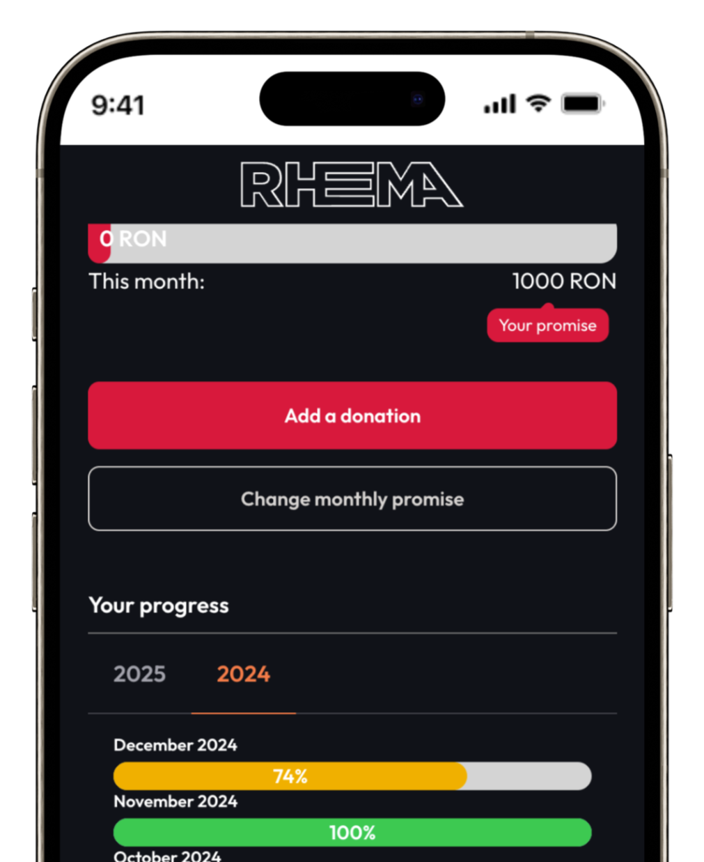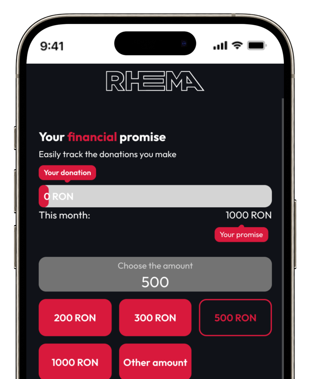 Promisiunile financiare (pledges) ajută membrii să se angajeze la donații lunare sau anuale. Acestea sunt urmărite cu bare de progres pentru a sprijini planificarea bugetului bisericii.